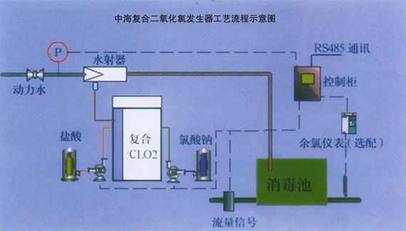復合二氧化氯發生器采用氯酸鈉、鹽酸為原料,負壓曝氣技術,現場制備以二氧化氯為主、氯氣為輔的復合消毒液。適用于飲用水、工業循環冷卻水、市政污水、董院污水、油田回注水、游泳池水、水產養殖用水等領域以及特種工業廢水的破氰、除酚、脫色處理。