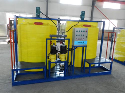 ZHJY型全自動加藥裝置為兩罐兩泵(可以根據實際選擇幾罐幾泵)型,主要由罐體、攪拌器、電機、支架、溶液桶等組成。罐體采用塑料或鋼制材料制 作,內部襯膠防腐,攪拌器由電機、機架、不銹鋼攪拌軸、葉輪組成,配平臺扶梯,并需加強防腐,支架由鋼件焊接組成,表面采用防腐處理。計量泵選用進口計量 泵。